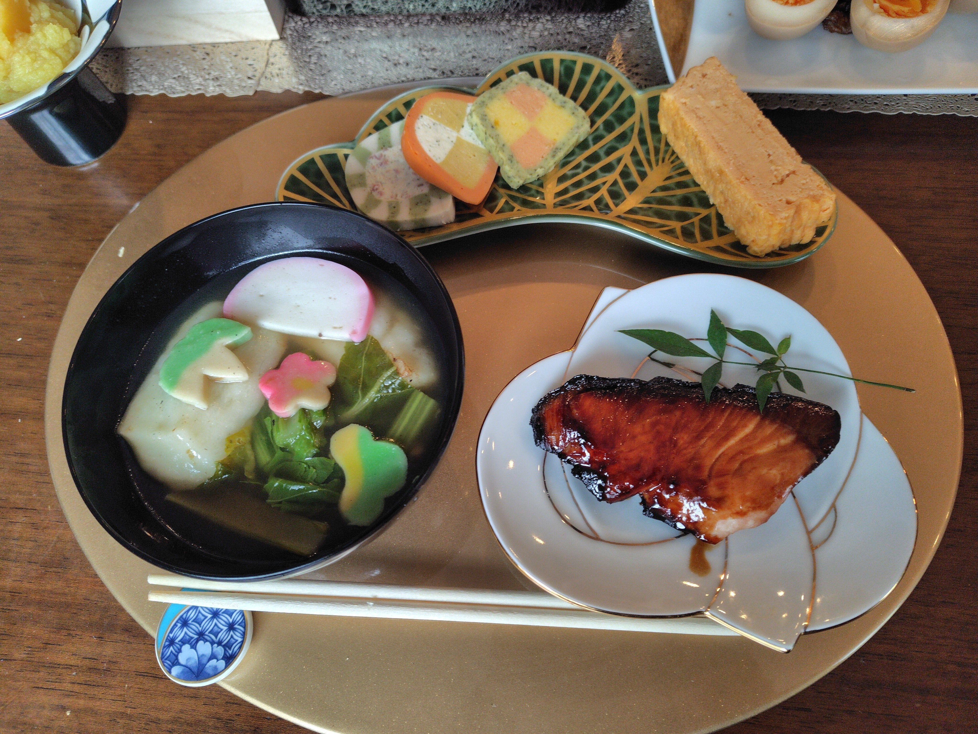 お正月、長女にオードブルと卵焼きを松の皿に盛り付けてもらいました。