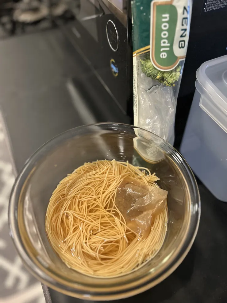 あと賞味期限が近いゼンブヌードルを使わないとーと思い、麺をだし汁に半日ほど浸してチンして食べました🍜
