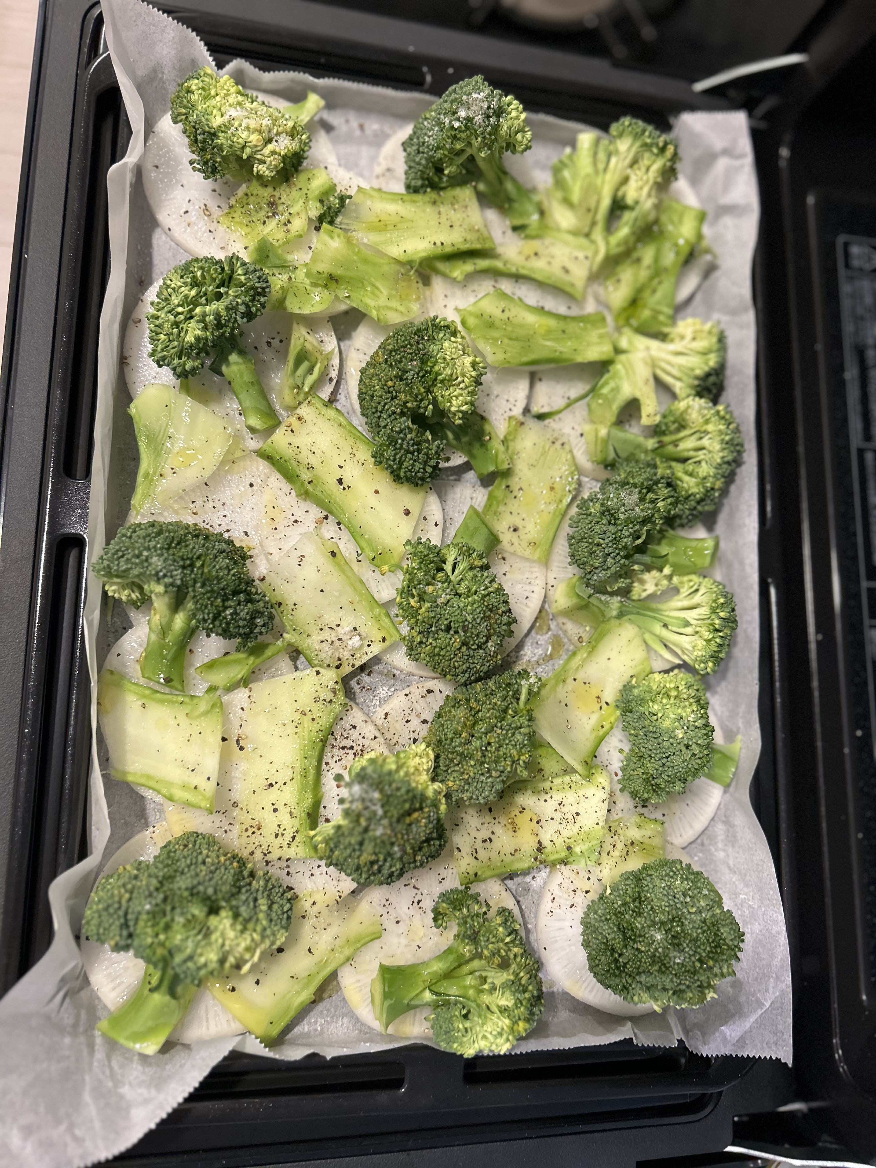 今回は使いきれない大根を5mm程度の輪切りにしたものをクッキングシートの上に並べ、その上にブロッコリー🥦