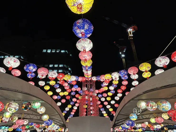 ふれあい広場は、カラフルなランタンが並び、幻想的な光景が広がってます。