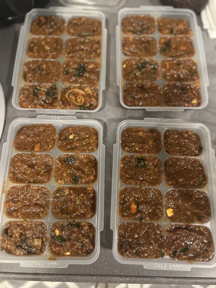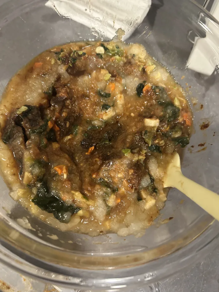 玉ねぎをすりおろして味噌とリンゴ酢を加えるのですが、乾燥野菜なんかもまぜまぜして(見た目汚いですけど)冷凍してます。