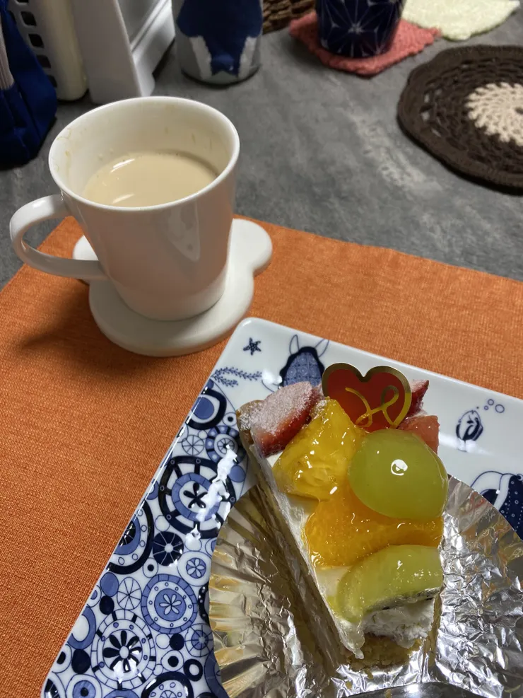 チキンは買って、具だくさん味噌汁と共に頂きました😋ケーキは、フルーツたっぷりタルトです(ひと口たべかけですみません💦)あまりにタルトを楽しみにしていたので写真撮ることを忘れて食べちゃいました( ´›ω‹`)💕