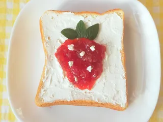 おはようございます🌅うらごしタイプのカッテージチーズがあったので、いちごジャムでいちご🍓にしてみました。葉っぱの部分は育てているミントを使いました🌿簡単すぎるけど、これも一応トーストアートと言っていいかな😅