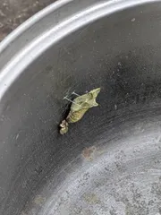 今朝もうこの姿になってましたなかなか途中経過は見れません下の方に幼虫の名残がみえます昨日の夕方色が変わってました 上手く蝶になるといいですね🦋